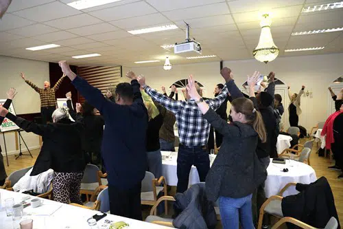 - Den enkleste metode til hurtigt og effektivt at ændre vores psykologi, går via vores fysiologi, forklarede Thomas Mygind, mens deltagerne eksperimenterede med at rette sig op, ændre ansigtsudtryk og mærke, hvordan den indre stemme forandrede sig. På samme måde kan sprogbrugen – både indre og ydre – skabe nye perspektiver.